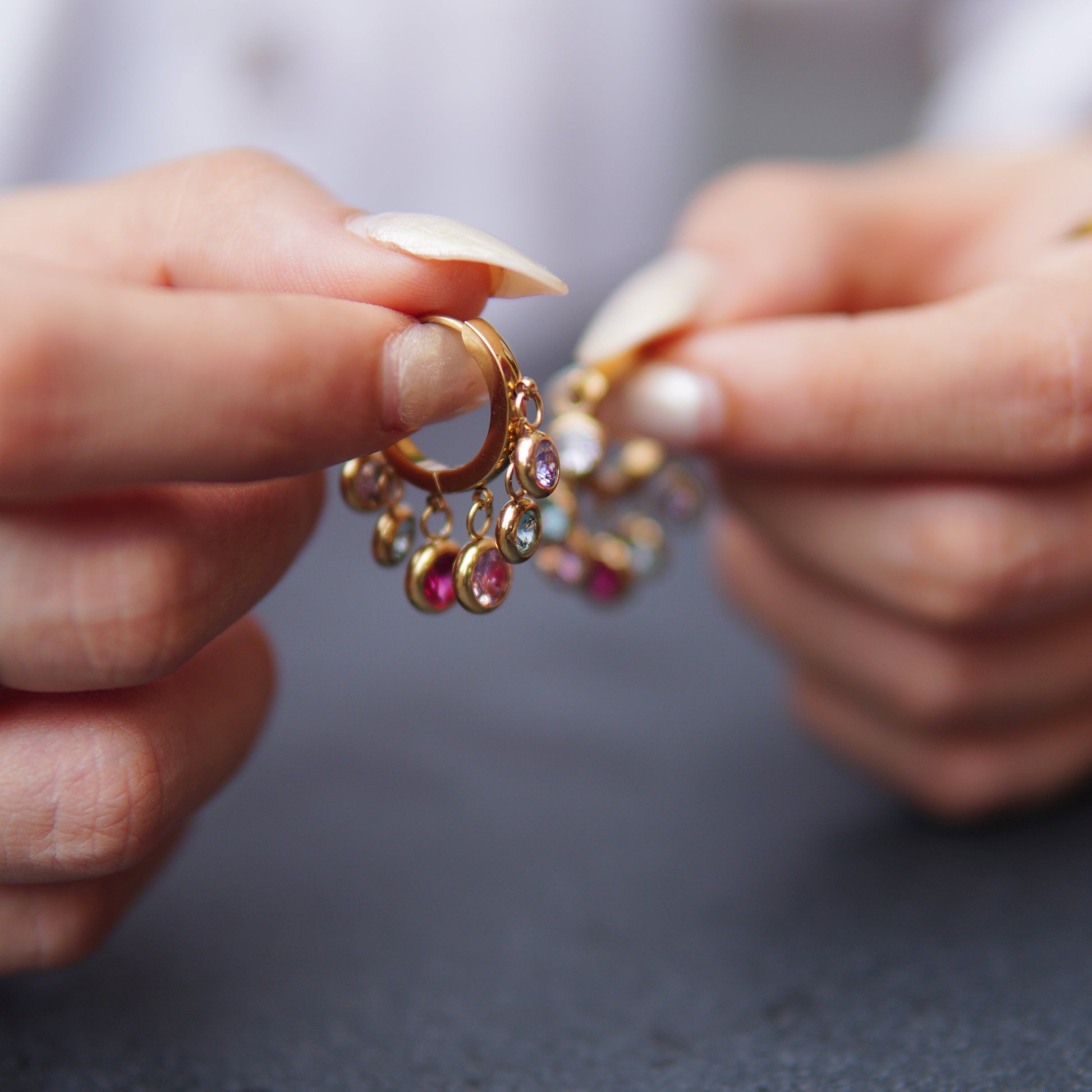 Det här är ett par slående örhängen som blandar klassisk hoop-design med en exotisk twist. De livfulla tricolour-stenarna och den delikata designen gör att de sticker ut i din smyckeskollektion som ett stilfullt statement-objekt.