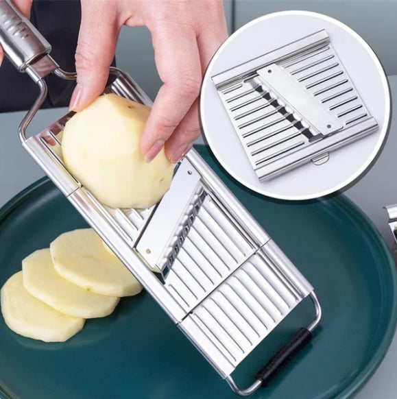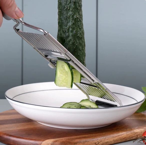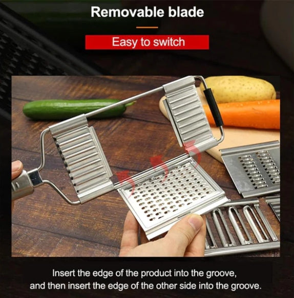 Den multifunktionella grönsaksskäraren har utbytbara blad som gör att du kan skära 8 skivor med bara ett svep! Strimla frukt och grönsaker utan ansträngning !