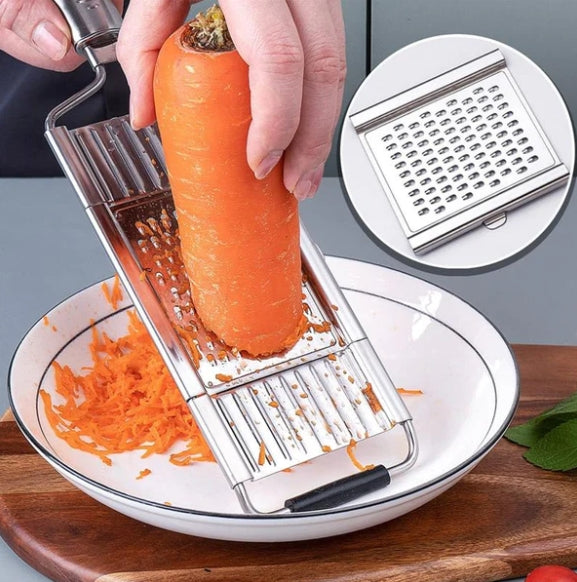 Den kan också användas som julienne-skivare, rivjärn för tunna skivor och osthyvel.